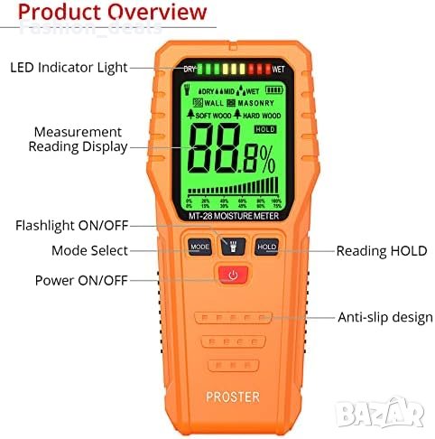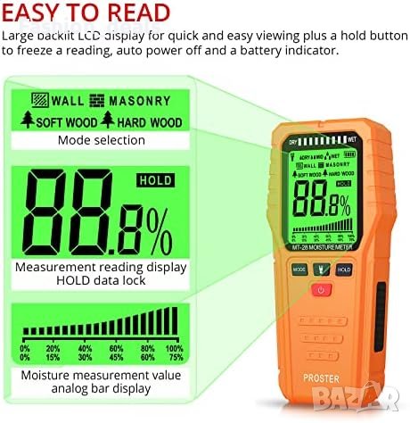 Лесен за четене: LCD екран с подсветка, три икони за ниво на влага, функция задържане на данни, LED фенерче и индикатор за слаба батерия.