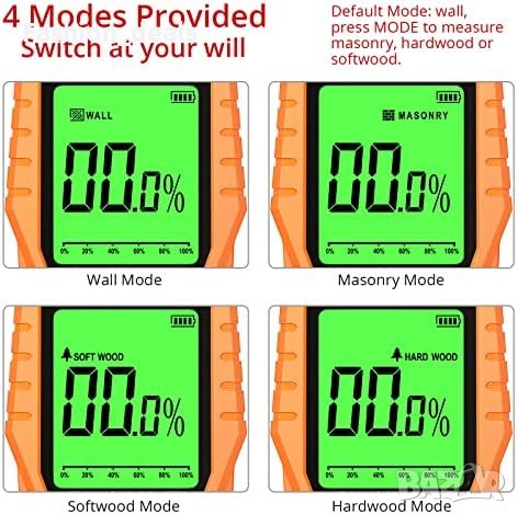 Четири режима на измерване: Открива влага до 19 мм под повърхността на стените, дърво и зидария.