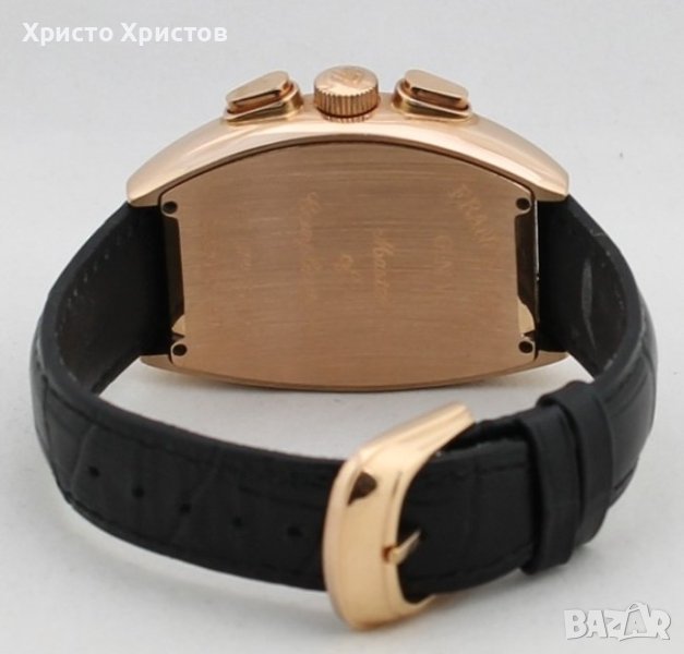Franck Muller Casablanca, кварц, хронограф, стоманен корпус розово злато, черен циферблат с дата в позиция 6 часа, фосфоресциращи стрелки, бели арабски цифри и черна кожена каишка.