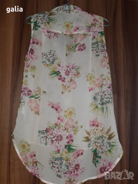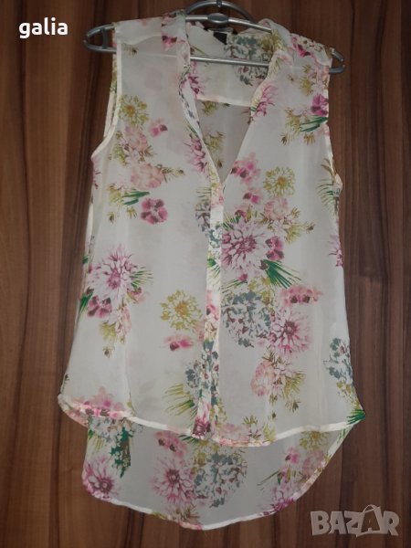Нежен топ от 100% полиестер. Дължина 60/74 см. Подмишници 48 см. Ханш 53 см. Не е носена. В отлично състояние.