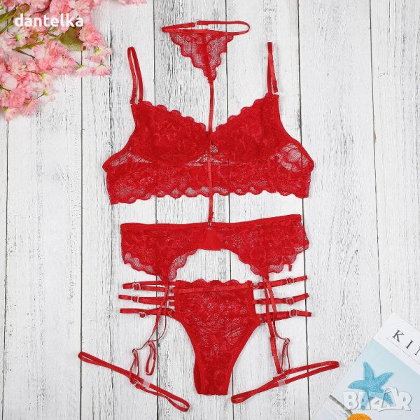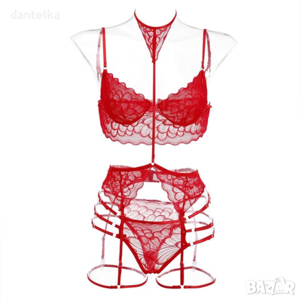 Дантелен комплект от 3 части, който задължително е секси и едновременно огнено червено крещи, че сме влюбени, отдадени и много страстни. Дантелен сет прилягащ нежно на фигурата ви, разбира се. Този модел дамско еротично бельо е съобразен с различните телосложения на дамите и е снабден с множество ластични ленти, които да прикриват и същевременно да подчертават детайли на фигурата. Всички части са обединени от идеята за сексапил. Ако искате да излъчвате лукс и сексапил ни се доверете! Завладяваща усмивка, очарователен вид и дантелено тяло – класическият образ на момиче в еротично бельо.