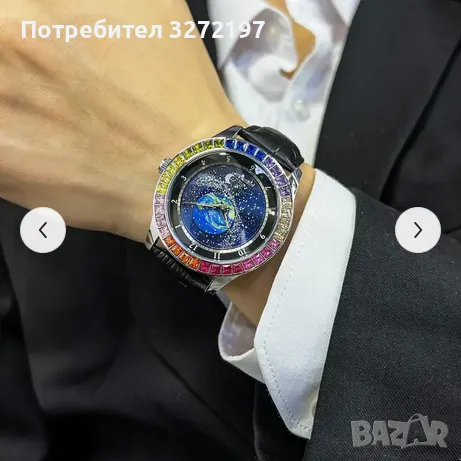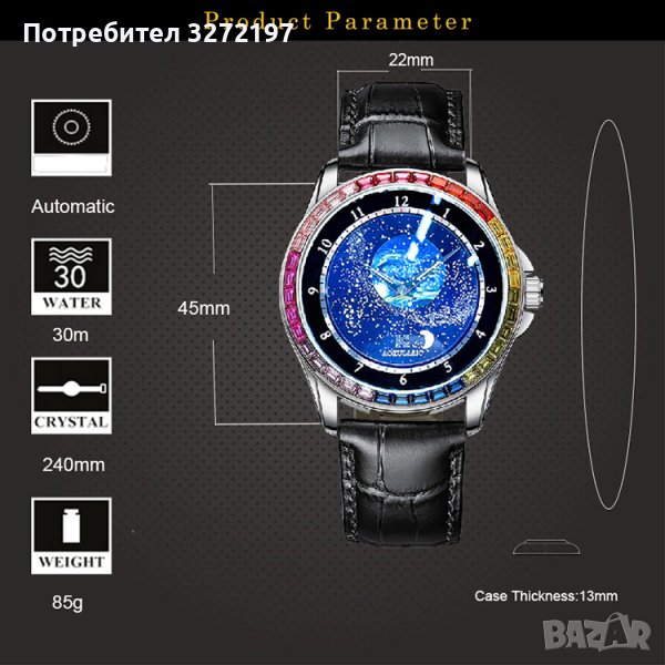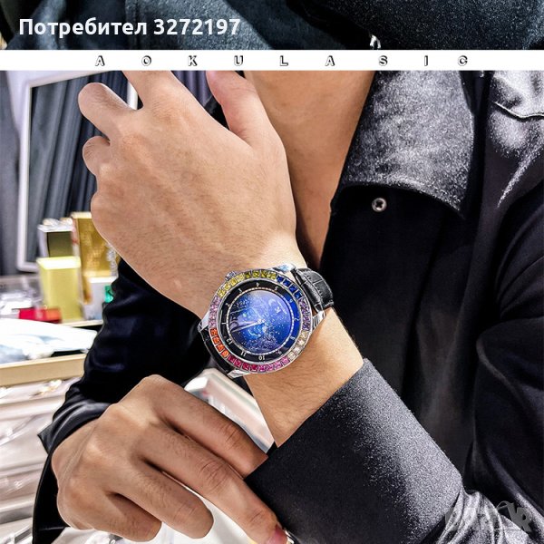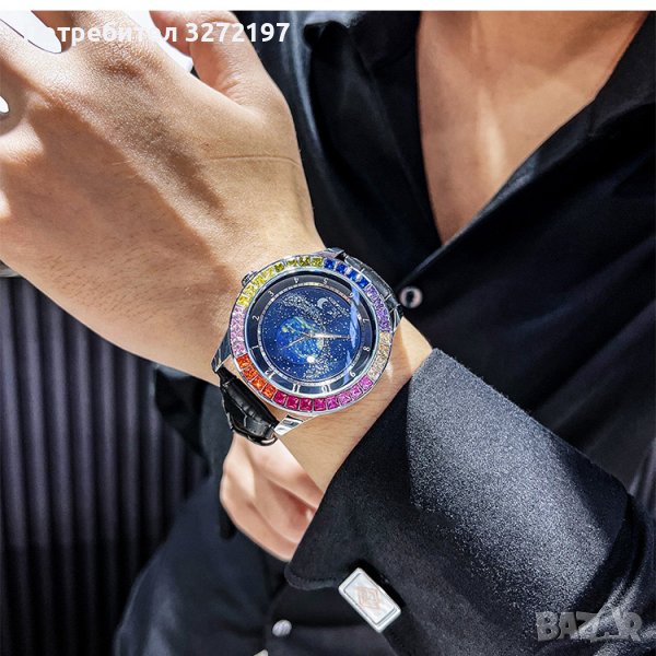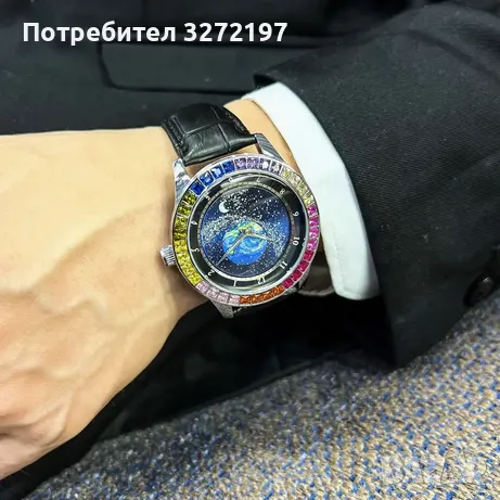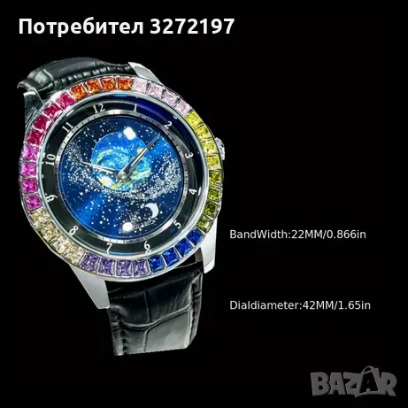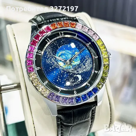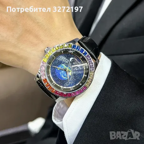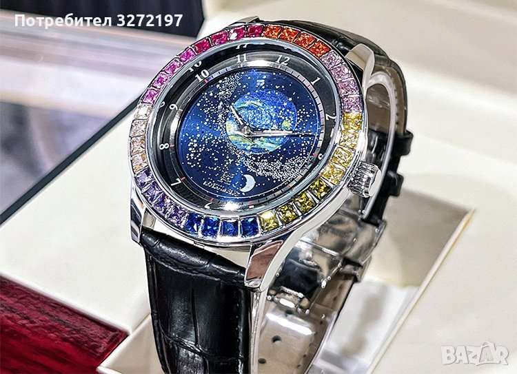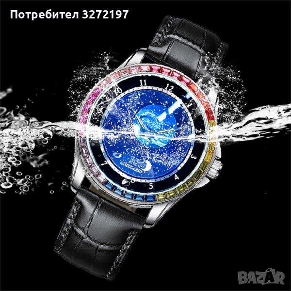 Изключително Красив Дизайнерски Автоматичен,механичен часовник с въртящ се циферблат ,небе и звезди на цифврблата ,цветни камъни на безела/рамката ,водоустойчив 30 м , 2 броя оригинални кожени каишки в комплекта/кутията.(1 бр.Черен цвят на часовника + 1 бр.Кафяв цвят).