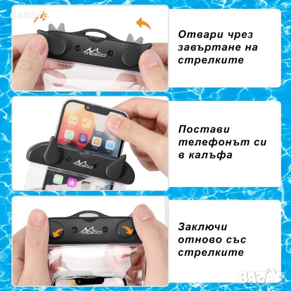Водоустойчивият калъф за телефон е един аксесоар, който ще защити телефона ви когато е с вас по време на море или басейн. Той ще бъде защитен от попадането на различни замърсители, като пясък, сол, масла против изгаряния от слънце, дори и влага. А за да сте още по – сигурни има и включена каишка към калъфа, с която ще можете да го прикрепите към врата си, също така има допълнителна каишка за поставяне на ръката.