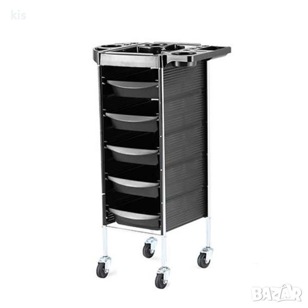 Функционален и практичен модел помощна фризьорска количка с 5 чекмеджета, горен плот снабден с удължители и с обособено място за поставяне на купа за боя, сешоар, четки за боядисване, ножици и други принадлежности. Количката е изработена от качествени материали, снабдена е с колелца за лесно придвижване.