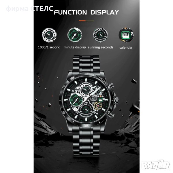 Часовникът също така разполага с функции за хронограф и дата, както и светещи стрелки за лесно четене на тъмно.