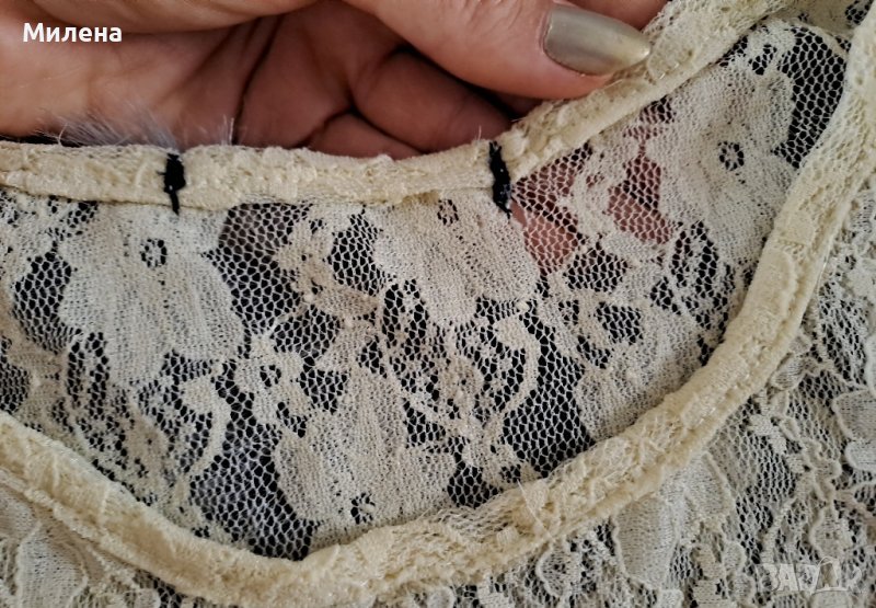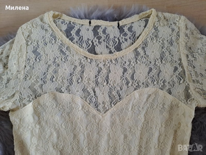 Дантелена рокля Xs размер, цвят шампанско с подплата е отдолу. Дължина 83 см., бюст измерен едностранно 33 см., има съвсем лека еластичност. Има забележка, малка дупчица, където е отрязан етикета, снимала съм на последната снимка.