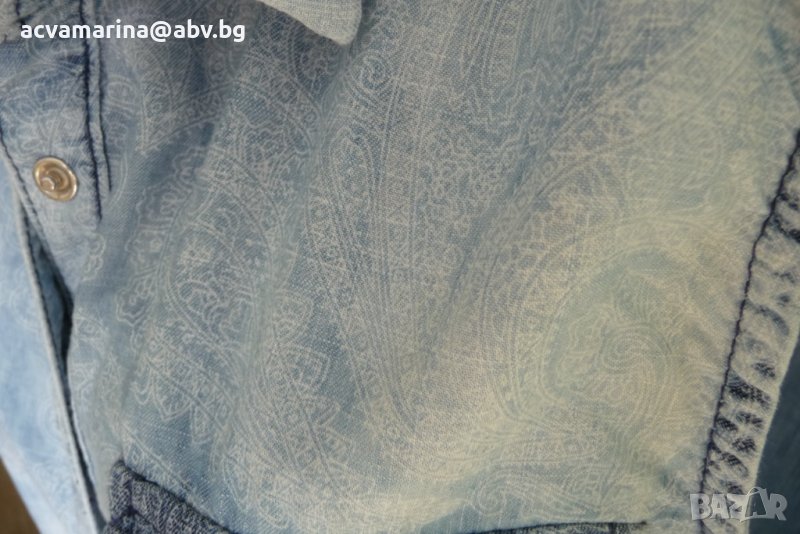 Лятна риза без ръкави , плата е тънък деним . Отблизо се вижда , че има шарки,но не мога да ги уловя при снимки . Може да се носи само ризата може и разкопчана с бюстие .