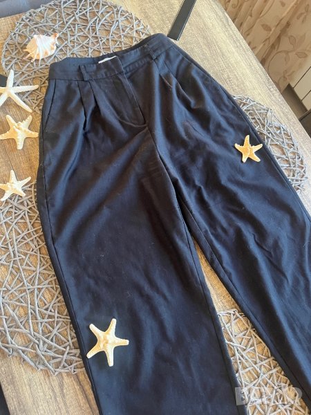 Панталонът е много актуален широк модел. Има леко завалване на плата отзад, но е труднозабележимо и цената е съобразена. Размер по етикет М, но отговаря на L.