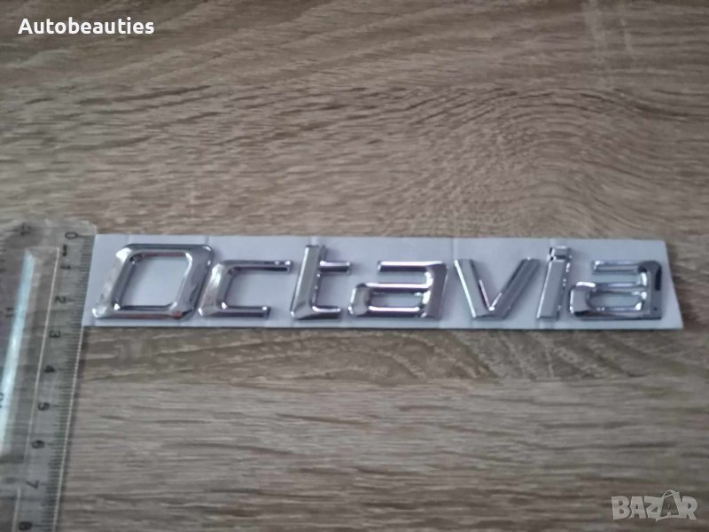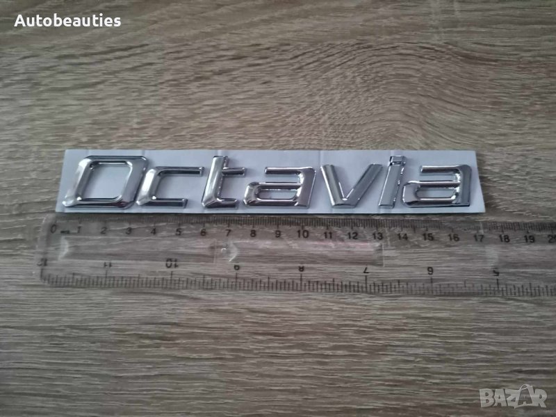 нов сребрист надпис за модела Octavia на Skoda в стария шрифт. Размерите са дадени на снимките.