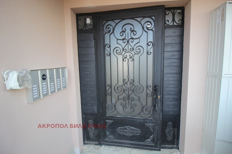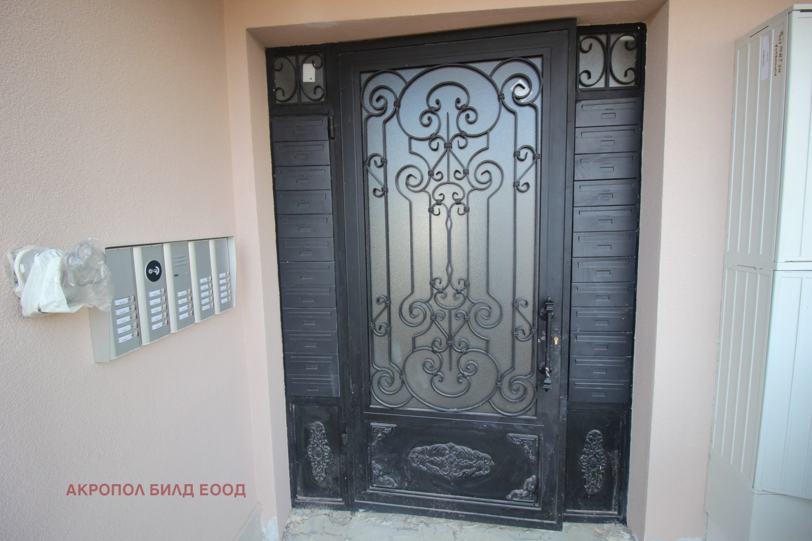 *Масивна входна врата на сградата-метална, оформена с пана от ковано желязо