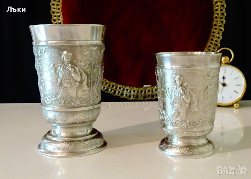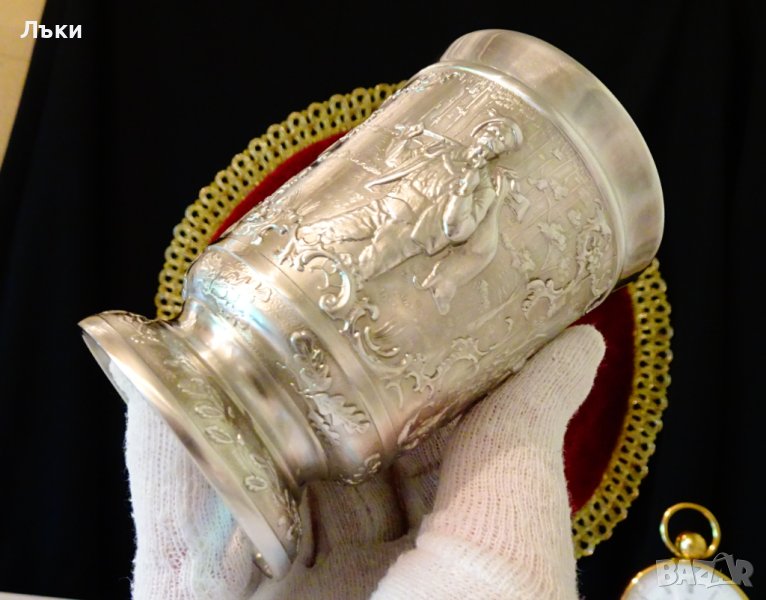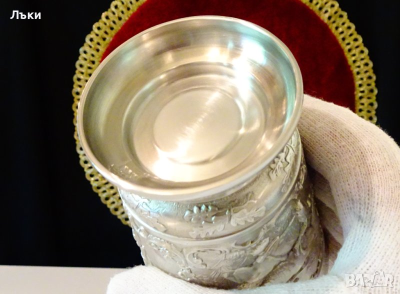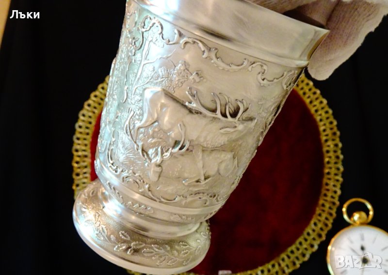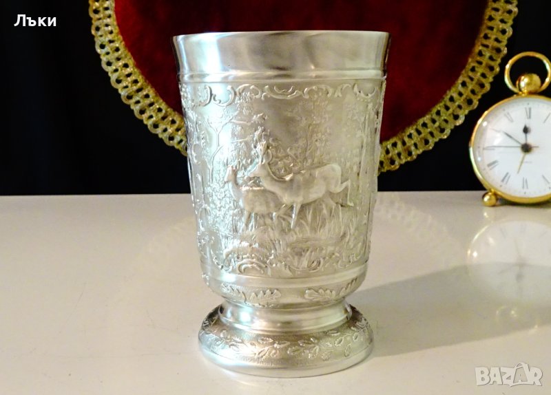 95% калай и 5% сребро,маркиран.Има три релефни картини – ловец с пушка и дивеч,красива сърна и млад сръндак,два Елена – горд победител и победен.Всяка сцена е обградена с барокови орнаменти и цветя.Височина 10 см.,диаметър 6.5 см.,тегло 240 гр.Вместимост 180 мл.
