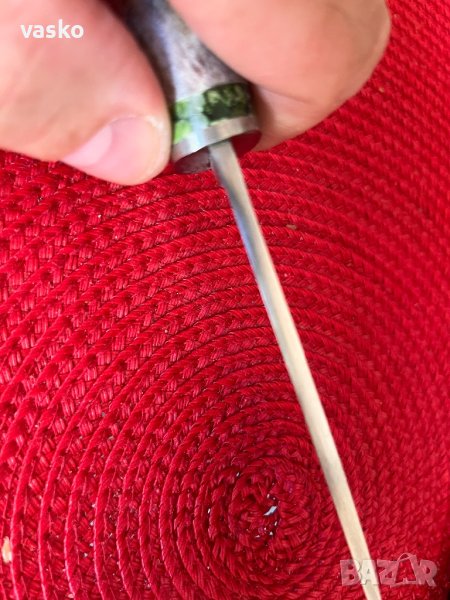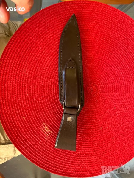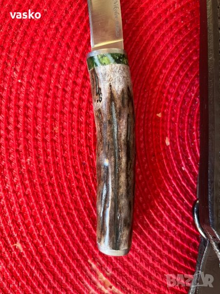 Продавам ножа от снимките-нов,не е ползван,стомана Елмакс,дръжка Еленов рог и пръстен фосил от мамут,обща дължина 20см,дължина на острието 10см,дебелина на острието при дръжката 3мм,ширина на острието при дръжката 1,8см,здраво и кораво ножче.Правено е от А Николов.Закалено е на 62 единици.Оригинална кожена кания правена за ножчето.Продавам го защото само си стои и не се ползва.Изцяло ръчна изработка.