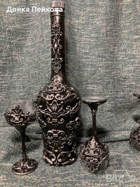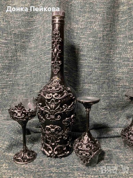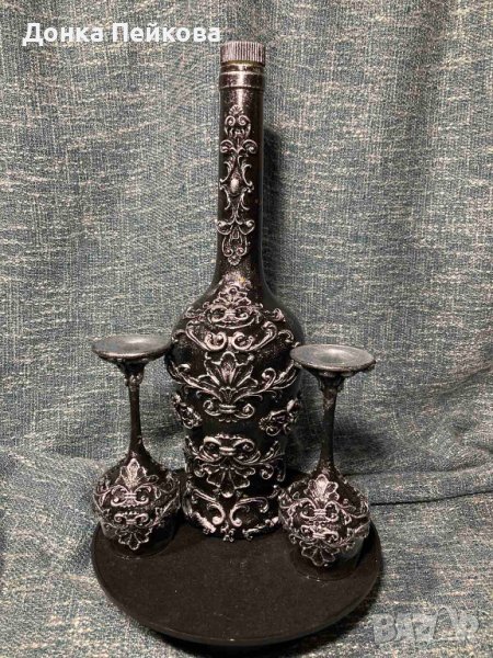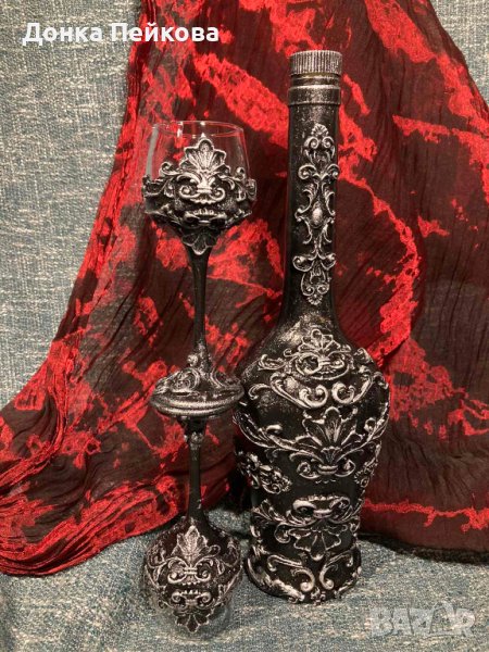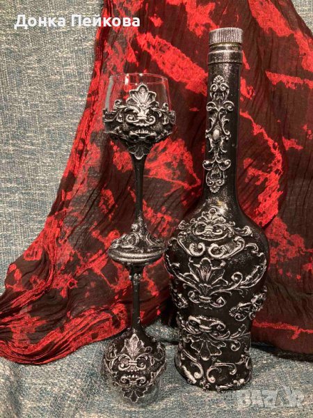 с имитация на сребро - един впечатляващ подарък за годишнина, за Рожден Ден, за абитуриентска, за сватба, за годишнина, подарък с който гарантирано ще впечатлите всички! Комплекта е единствен и няма да има друг такъв, което го прави уникален. Съдържа бутилка (която можете да напълните с алкохол по ваше желание) + 2 чаши. За изработката са използвани безвредни и водустойчиви материали. Може да се мие с мека гъбичка и без накисване. Да не се мие в съдомиална машина и да не се мие с гореща вода.