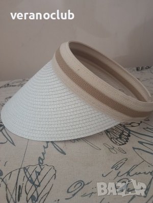 Красива бяла дамска лятна козирка от естествена материя. Козирката е подходяща за всички, които не обичат да носят шапки. Тя предпазва лицето от вредните слънчеви лъчи.