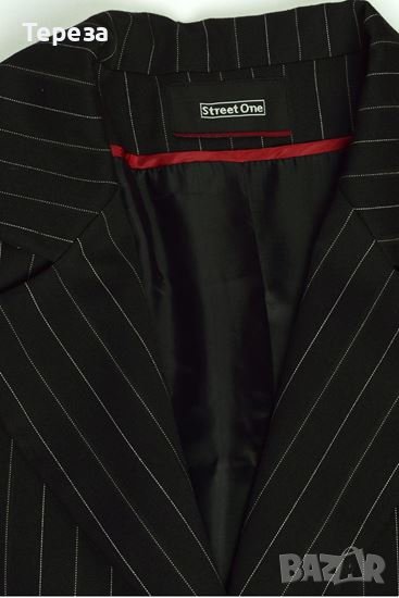 Елегантно дамско черно сако STREET ONE със ситно вертикално бяло райе. Класическо, с втален силует и изчистена линия.