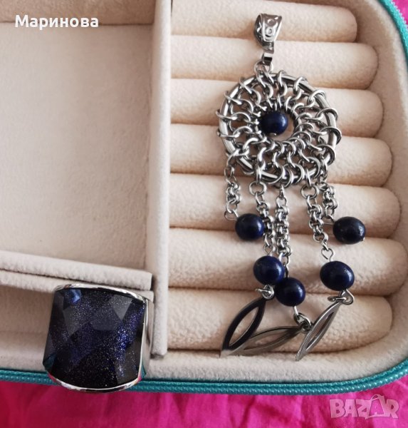 Прекрасен комплект с омагьосващия Слънчев камък. Пръстен и медальон. Диаметър на пръстена 17.5 мм, стоманен. Нови.
