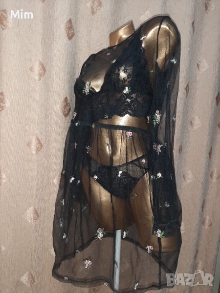 Черна рокля от прозрачен тюл с бродерия, с дълъг ръкав. Под мишниници 46 до 50 см едностранно, талия от 40 до 50 см едностранно пнадолу се разширява, дължина 84 см. Няма забележки. Бельото е в отделни обяви .