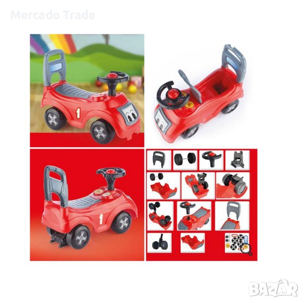 Детска количка - проходилка в червен цвят с големи черни джанти, предпазен гръб, капси и седалка, която се отваря и става място за съхранение.Това е безопасна и издръжлива конструкция за безкрайни часове забавление в първите стъпки на детето.