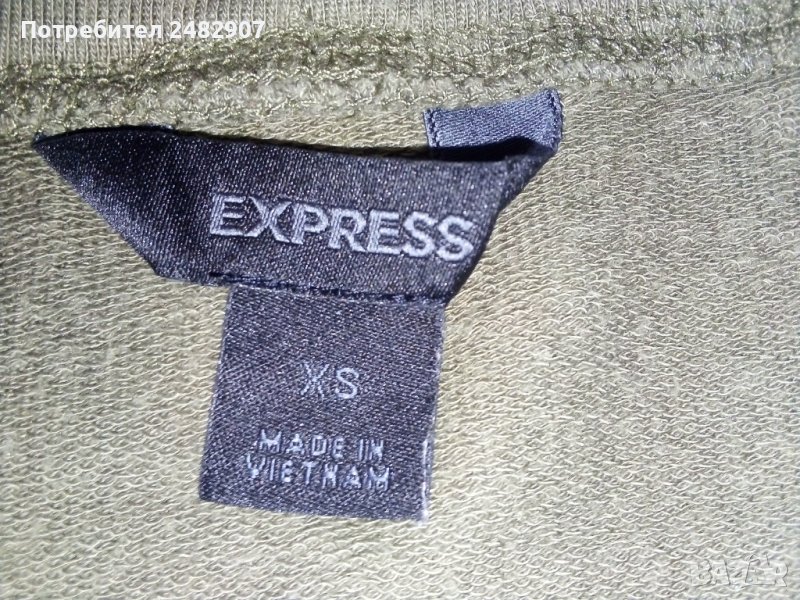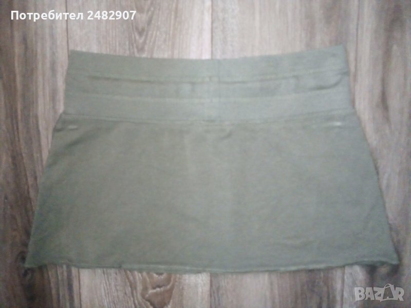 Къса дамска пола в маслено зелено, размер XS. Ширина в талията - 37,5 см, ширина в долната част - 55 см, дължина - 31 см. Съдържа 57 % памук, 38 % модал и 5 % спандекс, с два джоба отпред и връзки в талията. Много запазена, почти не е използвана, без забележки.