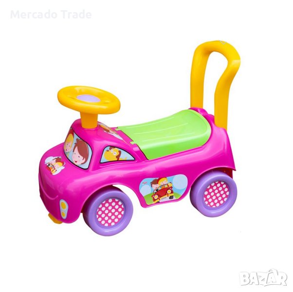 Детска количка - проходилка в лилав цвят с лилави големи колела, предпазен гръб и седалка, която се отваря и става място за съхранение.Това е безопасна и издръжлива конструкция за безкрайни часове забавление в първите стъпки на детето.