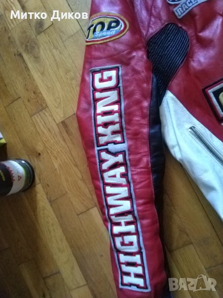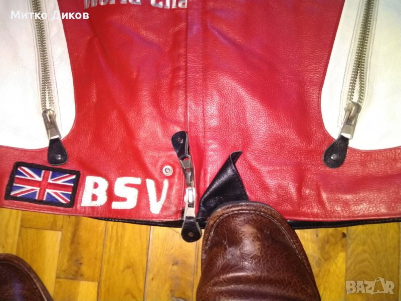 Мотористко яке оригинално марково на Англия от свет.шампионат в Ассен Холандия-ест. кожа-било е на човек от екипа или на състезател-има до знамето вдясно отдолу инициали-BSV-Bradley Smith-може би ? размер С-отгоре додолу-68см и подмишници-57см-в много добро състояние