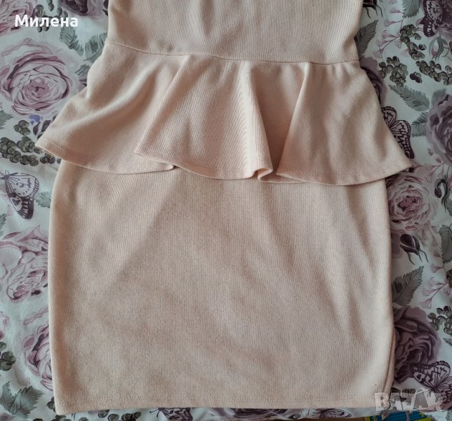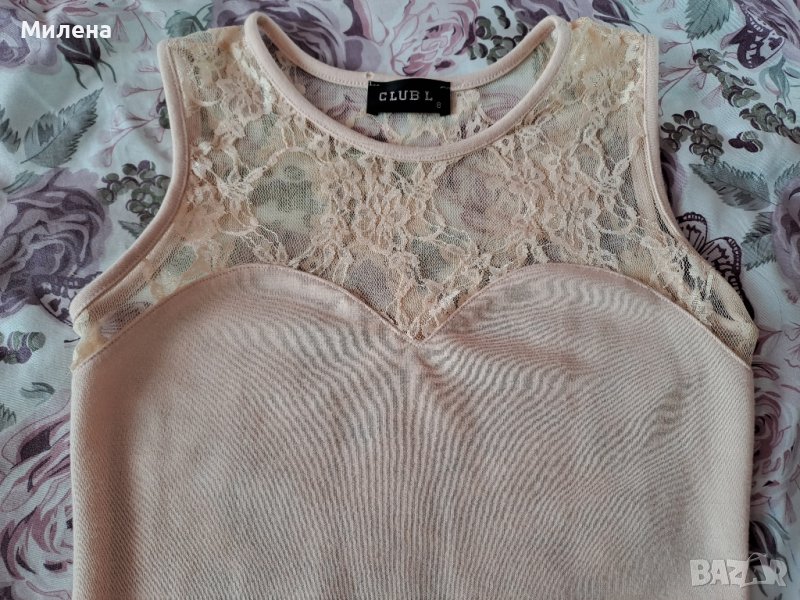 Елегантна рокля в блед розов/прасковен цвят, размер Xs/S, дължина 78, бюст измерен едностранно 35 см., има еластичност. Има забележка, дупчица в дантелената част на гърба, снимана на последните две снимки.
