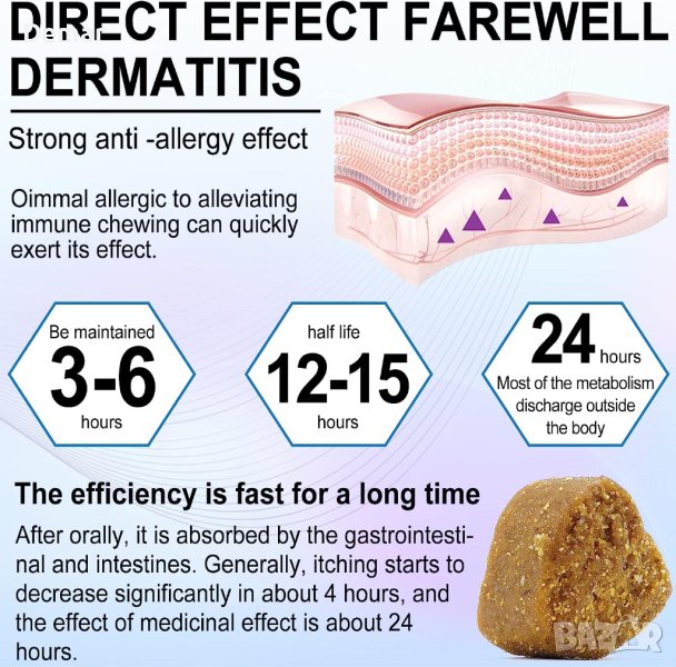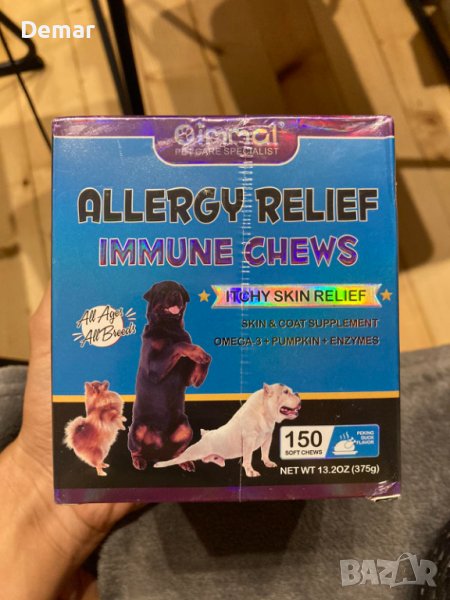Представяме ви нашите ефективни дъвки за облекчаване на алергии за кучета! Тези специално формулирани дъвки са предназначени да предотвратят и облекчат сезонните и хранителни алергии при кучета, като осигуряват облекчение от симптоми като близане на лапи, дразнене, сърбеж, дъвчене, надраскване, обриви и горещи точки. Имунната подкрепа в нашите лакомства е обогатена с омега 3 мастни киселини, насърчавайки здравето на ставите и мозъка на възрастните кучета и помагайки за потискане на хистаминовите реакции. Бъдете сигурни, нашите дъвки са направени от 100% натурални съставки, без изкуствени втвърдители или консерванти, за да гарантират благосъстоянието на вашите домашни любимци. Всяка вана съдържа 150 бр вкусни лакомства за кучета с вкус на патица по пекински, подходящи за всички кучета и типове кожа, включително кученца и възрастни на възраст 8 седмици и повече. Тези таблетки за дъвчене за имунитет са идеални за всички породи и размери кучета, което ги прави идеалният избор за нуждите на вашите космати приятели за облекчаване на алергията.
