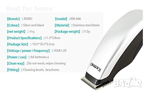 Комбиниран пакет от мини тример за коса Kemei KM-666 с батерия Електрическа машинка за подстригване Машина за подстригване Мъжка бръснарска бръсначка за брада за домашна употреба. Сега имайте професионален поглед към комфорта на вашия сладък дом, без да се излагате на опасна ситуация, като посетите салон и бръснарница. Характеристики: Изработен от първокласен ABS, устойчив на износване и издръжлив. Прецизно остро и издръжливо острие за осигуряване на точност на рязане. Работи с батерии, лесен и удобен за използване. С 3 различни аксесоара, отговарящи на вашите различни нужди. Опростен цветен дизайн, приятен и приятен за окото. Предлага се с почистваща четка за лесно почистване. Описание: Компактен размер, преносим, лесен за носене. Изящната изработка осигурява дълъг експлоатационен живот. CE одобрен, по-безопасен за потребителите. Спецификации: Име на марката: KEMEI Модел: KM-666 Материал: ABS Цвят: сребрист и черен Размер: 112*28 mm Мощност: 3 W Входно напрежение: 1,5 V Батерия: 1 * 1,5 A AA батерия (НЕ е включена) Включен пакет: 1 x Тример за коса 1 x Четка за почистване 3 x Водещ гребен