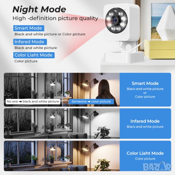 --【Три режима】Интелигентен режим, инфрачервен режим, цветен светлинен режим.