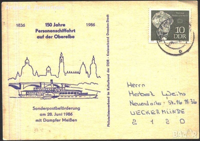 Пътувала пощенска картичка Корабоплаване 100 години Пътнически превоз по Горна Елба 1986 Германия / ГДР.