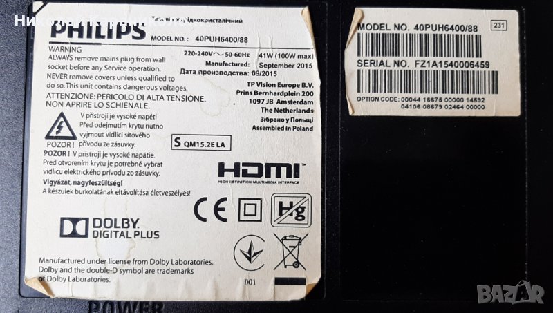 Продавам тв. PHILIPS 40PUH6400/88 за части по причина-счупена матрица/TPT400LA/.Редовни съответно: