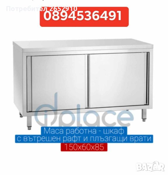 Работни маси-шкафове с вътрешен рафт и плъзгащи врати, за по-удобно и практично организиране на работното пространство. Изработка от неръждаема стомана, коeто осигурява дълготрайност и здравина на конструкцията. Този тип материал гарантира, че масата ще издържи на тежки товари и интензивна употреба.