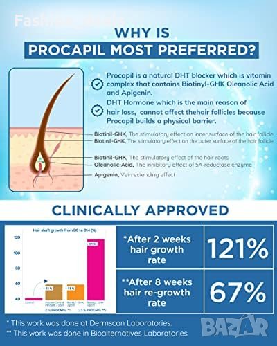 Съдържа прокапил и витаминен комплекс, които стимулират растежа на косата и блокират хормона DHT.