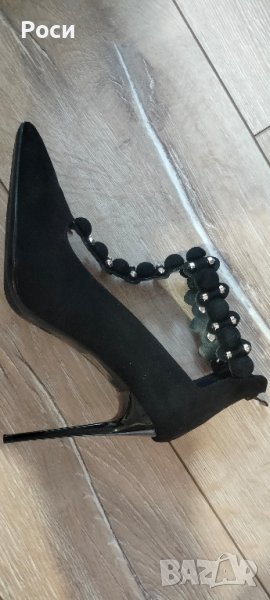 нови елегантни дамски обувки на висок ток в черно с каишка около глезена и метални детайли на нея. Номер 39 със стелка 24,5см. ток с височина 10см.