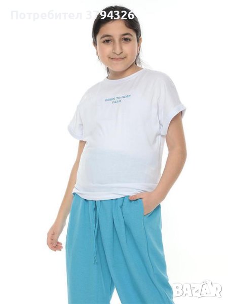 Елигантен лятен комплект за момиче , два цвята . Тениска 100% памук . Панталони 60% вискоза , 20% полиестер , 20% лен .
