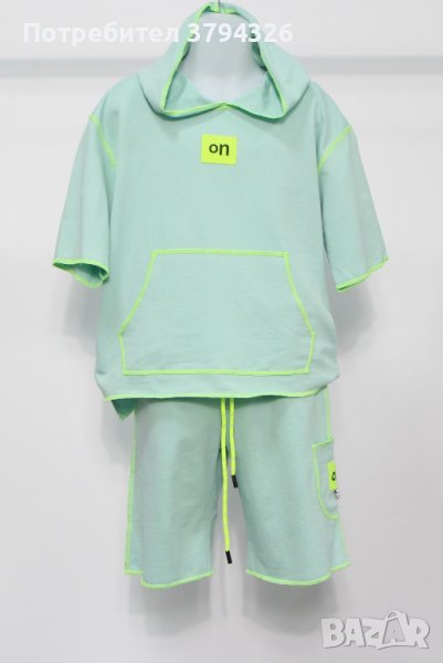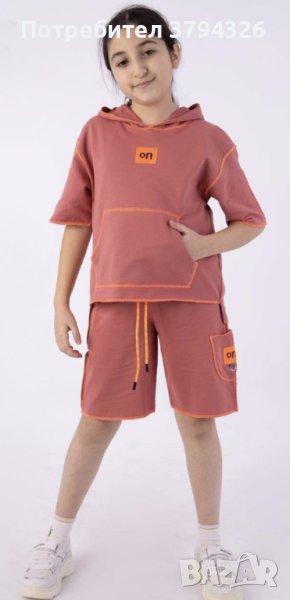 Памучен комплект за момиче с къс ръкав и къси панталони и закачулка.