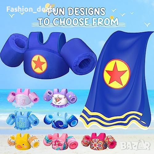 Жилетката за плуване се предлага с иновативна подвижна пелерина с ярки шарки, които правят плуването и плажните приключения забавни за децата. Яркият и цветен дизайн помага на родителите или наблюдателите да държат детето под око, като гарантират безопасността му в претъпкани райони.
