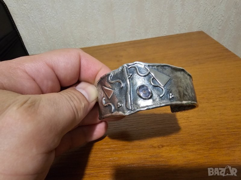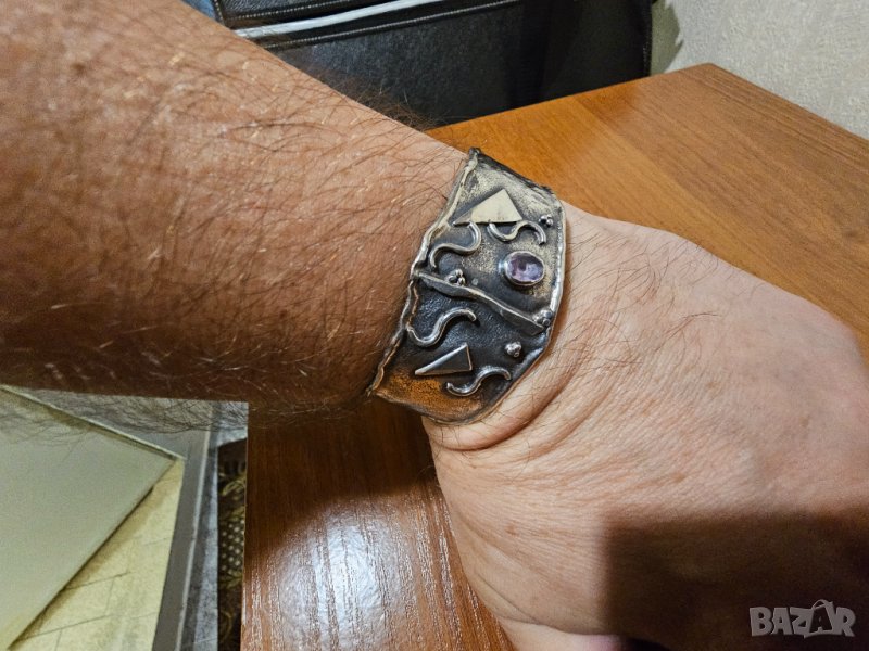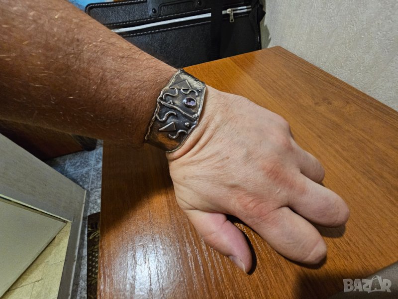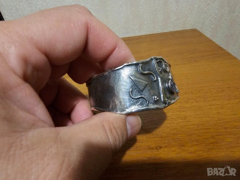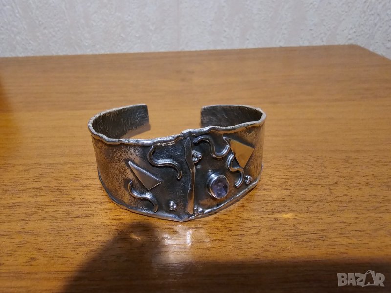 Голяма кована стара сребърна гривна с аметист ковано сребро и много орнаменти майсторка изработка