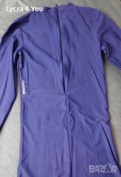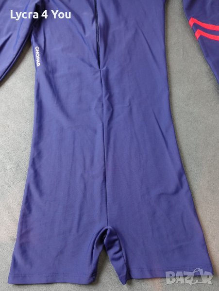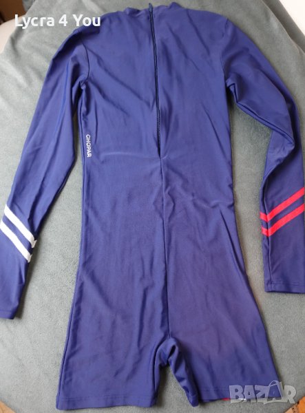 Като ново, дамско спортно трико тип гащеризон с къс крачол и дълъг ръкав в тъмносин цвят и със закочаване с цип отзад на гърба.