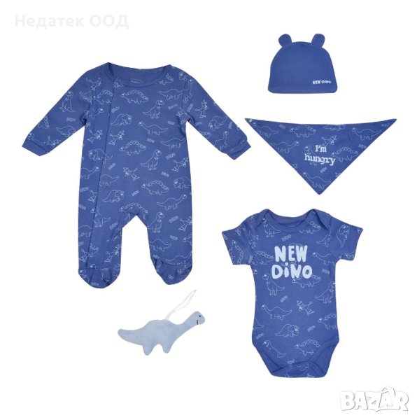 Подаръчен комплект за новородено момче в красива прозрачна кутия. Комплектът включва боди със син динозавър с дълъг ръкав със странично закопчаване и затворени крачоли, боди с къс ръкав с долно закопчаване в същия дизайн и щампа "НОВО ДИНО", лигавник мантана с щампа „Гладен съм“ и шапка с щампа "НОВО ДИНО" , пплюшена висяща играчка син динозавър (20x8 см).