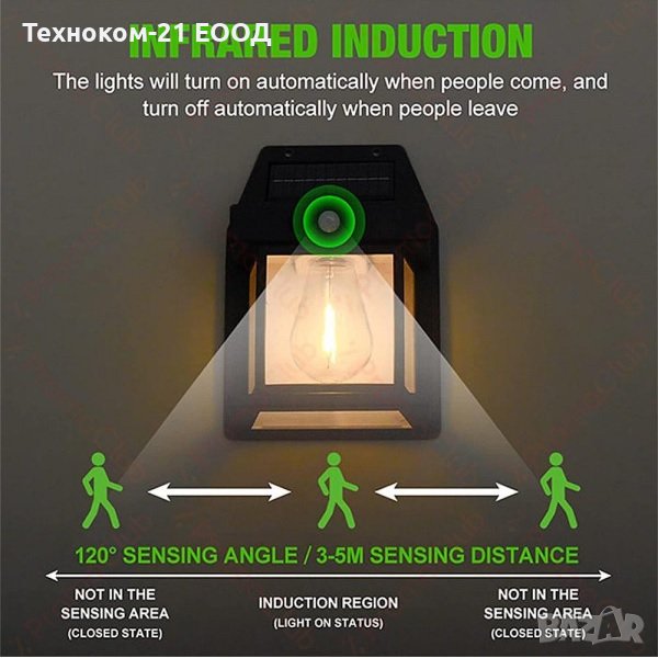 Декоративна соларна лампа с двупосочно осветяване за фасада и красив визуален ефект. Тя ще освети атрактивно стената на кащата, външните стьпала или оградата на двора.Соларната лампа се зарежда през деня и автоматично се включва през нощта.