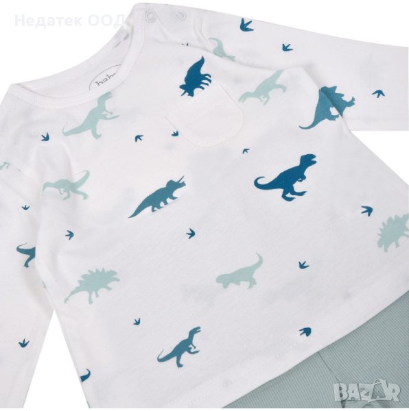 Бебешки комплект за момче, бяла памучна тениска с дизайн на динозавър, джоб, дълги ръкави с обръщане и копчета отстрани.