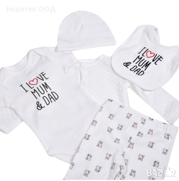 Подаръчен комплект за новородено момче в красива прозрачна кутия. Комплектът включва бяла тениска с щампа "I LOVE MUM & DAD" с къси ръкави, закопчаване на долната част, бели подходящи панталони със затворени крачоли, бял лигавник с бродирани букви, бяла шапка с червено сърце и бяла жилетка с копчета с релефен капитониран дизайн.
