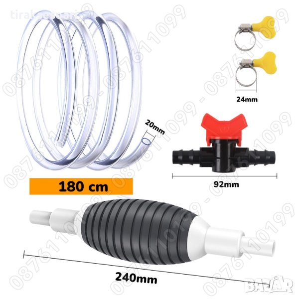 Ръчна помпа с маркучи за трансфер на течности. Работи на вакуумен принцип, функционира само в една посока. Маркуча в комплекта е PVC и е прозрачен с цел по-лесно да се следи преливането. Хубавото при помпата е, че не е необходимо захранване и може да се използва навсякъде, където има нужда от нея. Компактните и размери позволяват лесно пренасяне. Подходяща е за вода, масла, гориво(бензин, дизел) и др.