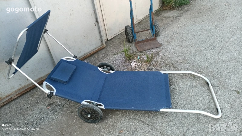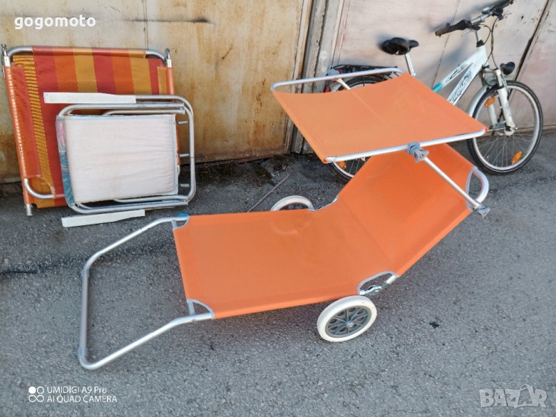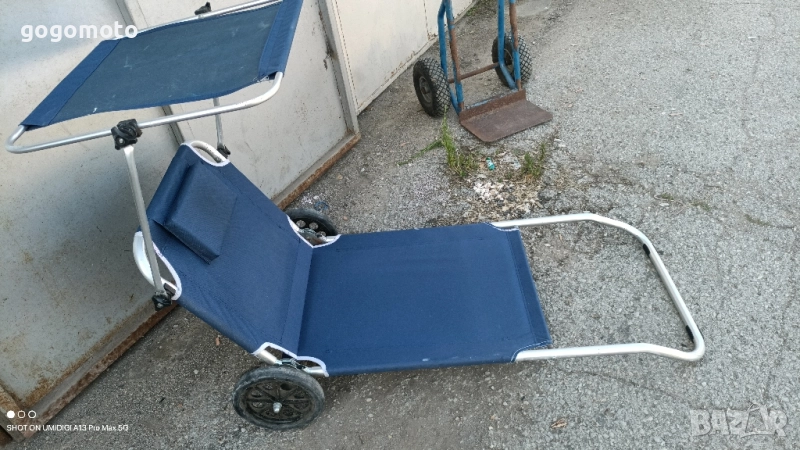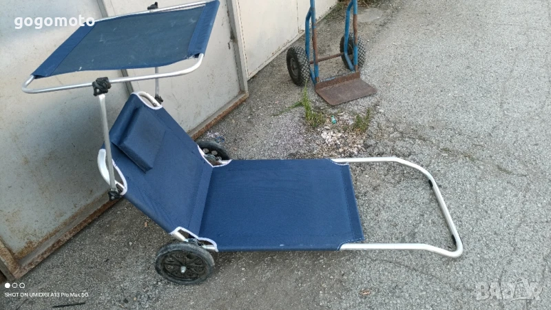 шезлонг на колела, сгъваемо легло за плаж, сгъваем стол + сенник. Всички данни са на снимките Моля вижте фото Цената е за брой шезлонг СИН на колела! Ултра лек шезлонг на колела за плажа.