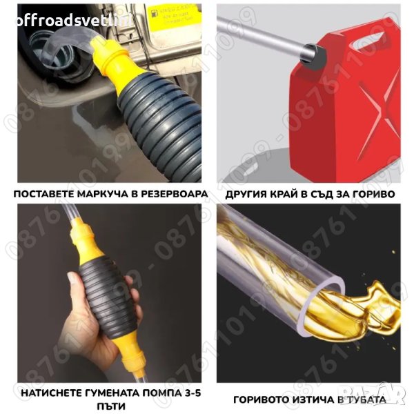 Ръчна помпа с маркучи за трансфер на течности. Работи на вакуумен принцип, функционира само в една посока. Маркуча в комплекта е PVC и е прозрачен с цел по-лесно да се следи преливането. Хубавото при помпата е, че не е необходимо захранване и може да се използва навсякъде, където има нужда от нея. Компактните и размери позволяват лесно пренасяне. Подходяща е за вода, масла, гориво(бензин, дизел) и др.