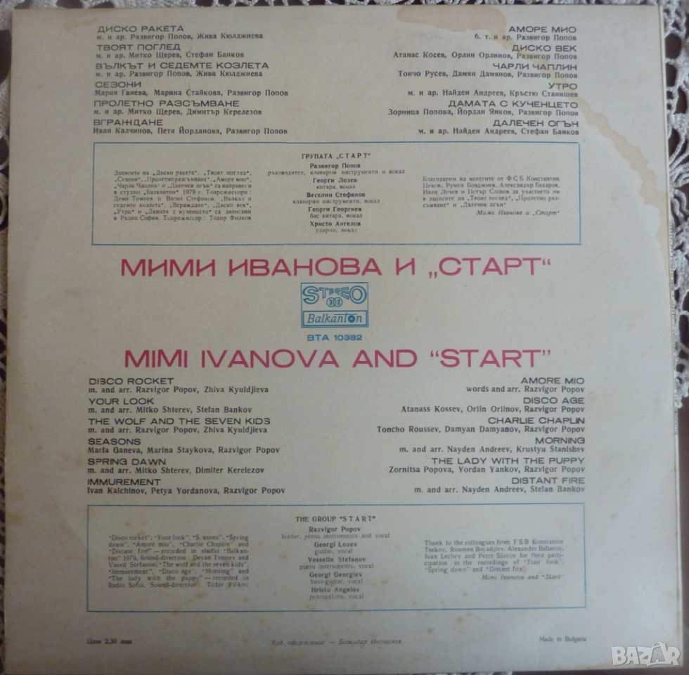 Мими Иванова и Старт - Мими Иванова и "Старт", ВТА 10382 в отлично състояние. Цена 10.00 лева.