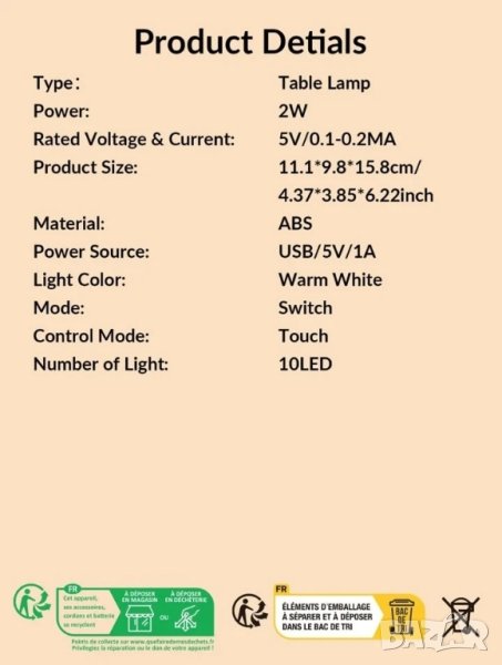 - Комплектът включва USB кабел за захранване (съвместим с адаптер от зарядно за телефон)
