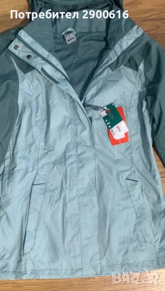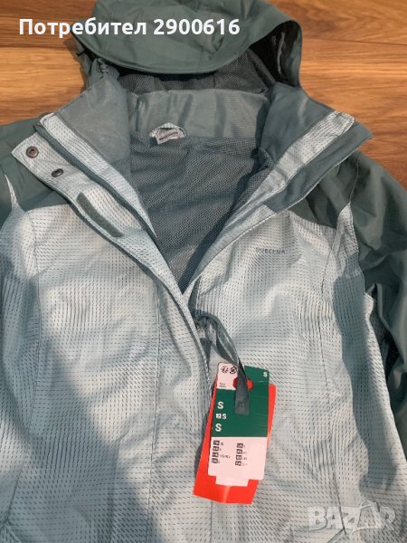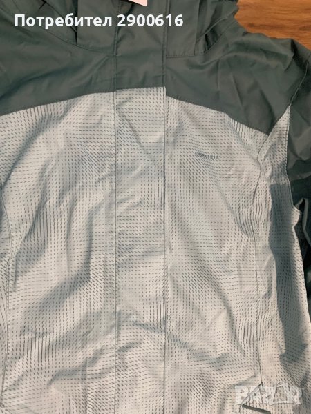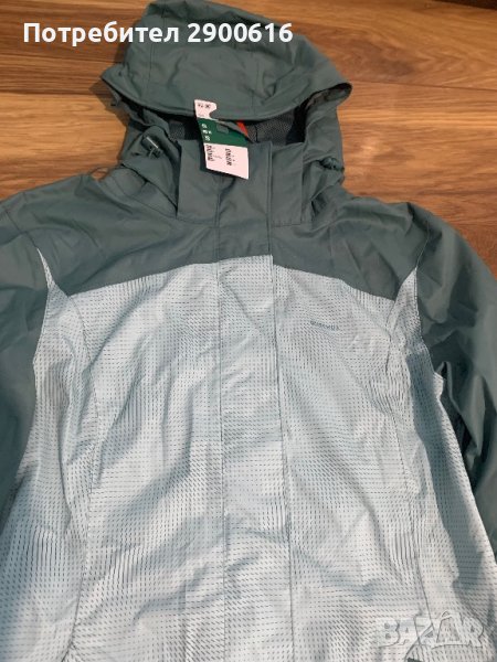 Ново дамско яке Quechua. Подходящо е за против дъжд и вятър. Качулката се сваля. Закупено е от декатлон на цена 90 лв.