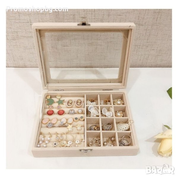 Кутията е разделена на две отделни пространства. По този начин можете лесно да намирате и съхранявате любимите обеци, пръстени, гривни и други бижута.
